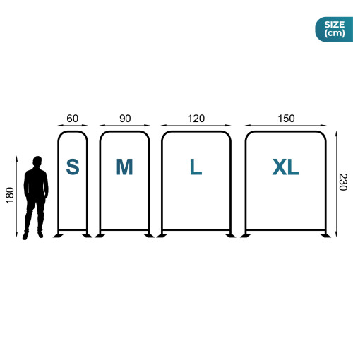 Vi tilbyder fire størrelser. Med en bredde fra 60 til 150 cm og en fast højde på 230 cm, så du kan vælge den, der passer bedst til din kundes behov.