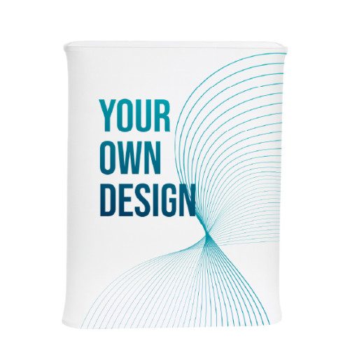 Double-sided printing on Blackback fabric that fits perfectly to the structure, remaining taut and eliminating wrinkles. It has a white wooden countertop and a hollow interior that can be used as a small storage space. Due to the high temperatures involved in the sublimation process, the fabric may experience a slight change in size.