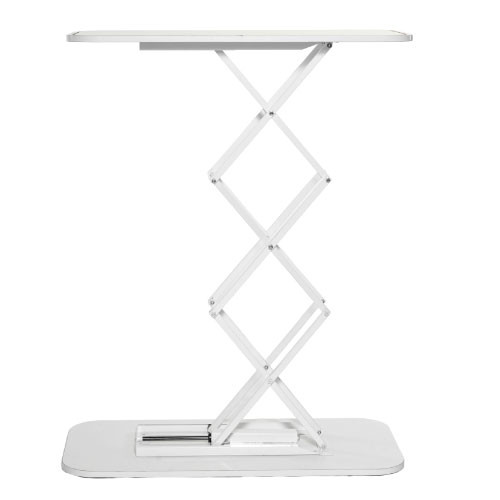 Made up of an accordion-style steel structure with a white wooden base and worktop.