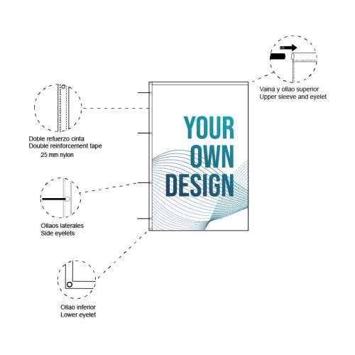 Gaine La gaine du drapeau est fabriquée en fonction de la largeur du produit. Manche fermée en haut et en bas. Ruban de renforcement et œillets sur le côté gauche tous les 100 cm. Œillet de 1 cm de diamètre intérieur. |