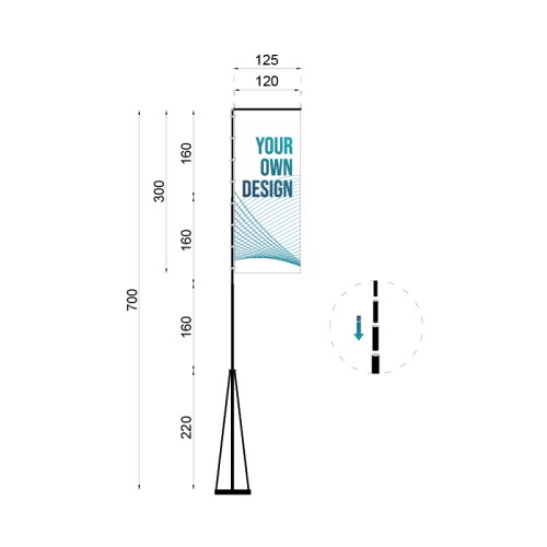 Bandeira impressa com 3 metros de altura e 1,20 metros de largura. Mastro telescópico principal Altura: regulável de 5 a 7 metros. Altura dobrada: 2,2 metros. Diâmetro: - 5,5 cm no segmento mais próximo da base. - 3 cm na parte superior. - Braço de potência com 1,25 metros de comprimento e 2 cm de diâmetro. Base: 70 cm de comprimento, 70 cm de largura e 20 cm de altura. Anel duplo grande: Maior diâmetro exterior: aprox. 6 cm Diâmetro mais pequeno: 2,5 cm. Ilhós com um diâmetro interior de 1 cm. |